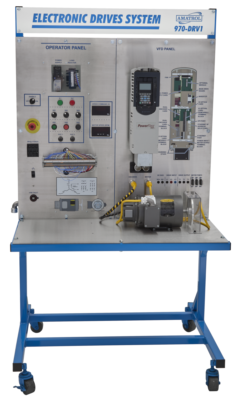 The AC Electronic Drive Learning System – AB PowerFlex 755 (970-DRV1F) provides comprehensive, hands-on training for AC variable frequency drives (VFDs) using real industrial hardware. Designed for advanced technical education and industrial workforce development, this system prepares learners to install, configure, program, communicate with, and troubleshoot modern AC electronic motor drive systems used throughout manufacturing.