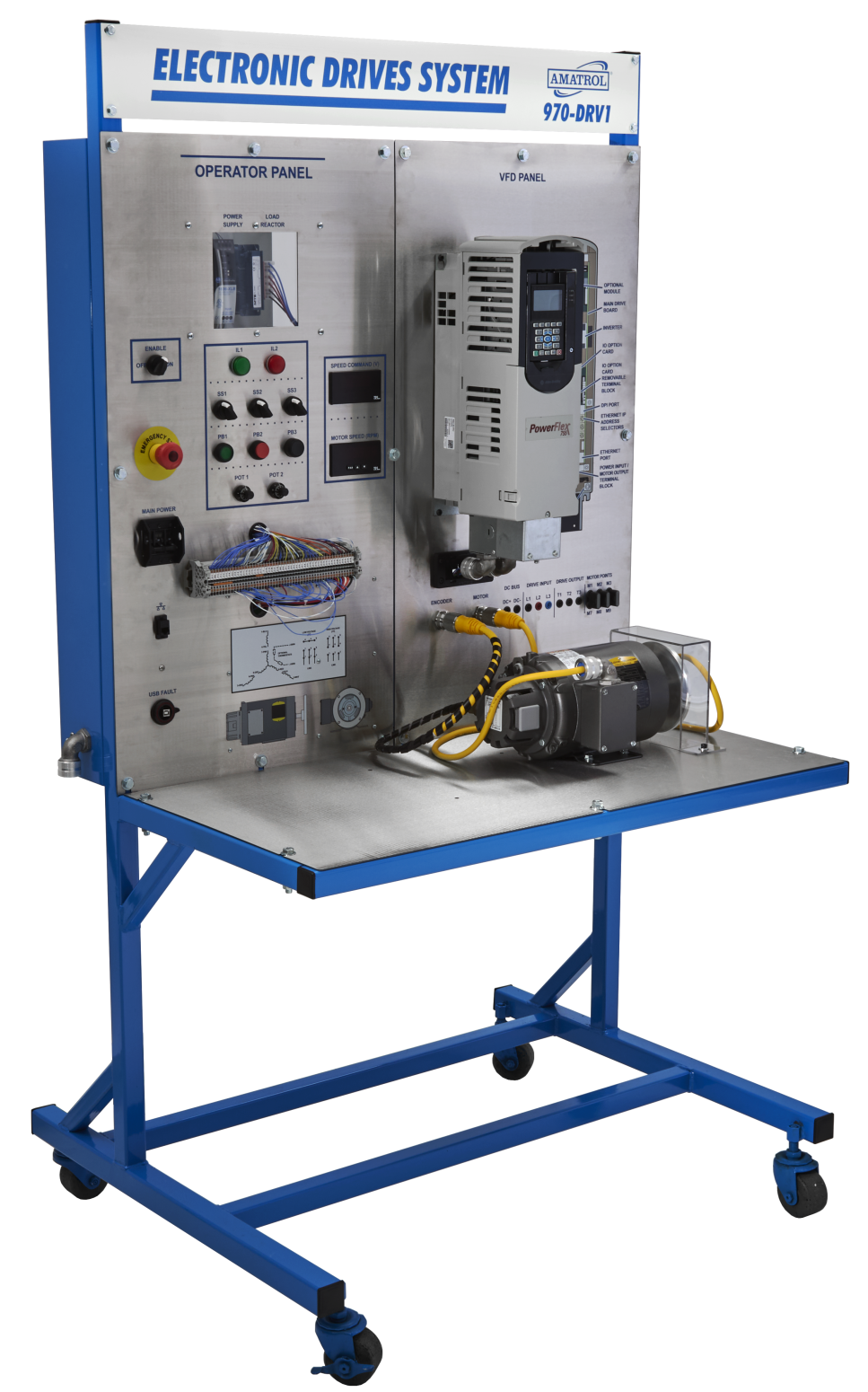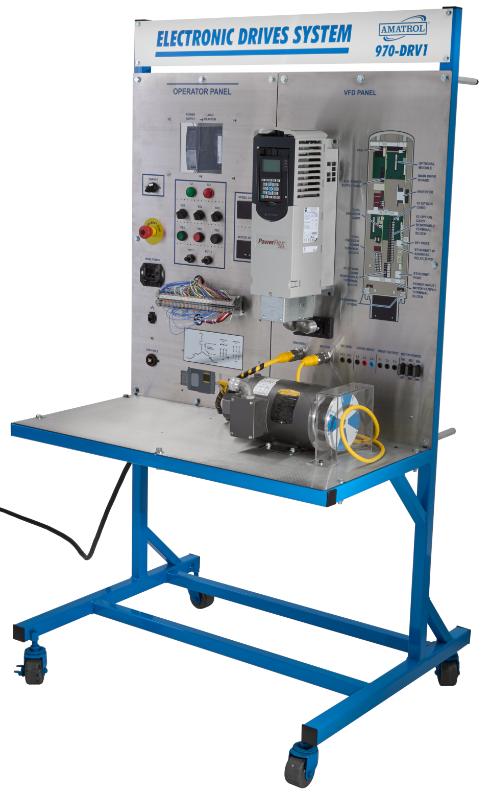 This AC electronic drive trainer features a rugged, transportable design suitable for labs, classrooms, and mobile training environments. The system includes dedicated operator and VFD panels that place controls, indicators, and test points within easy reach.